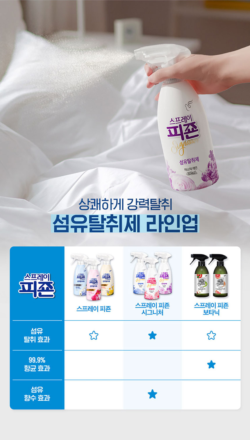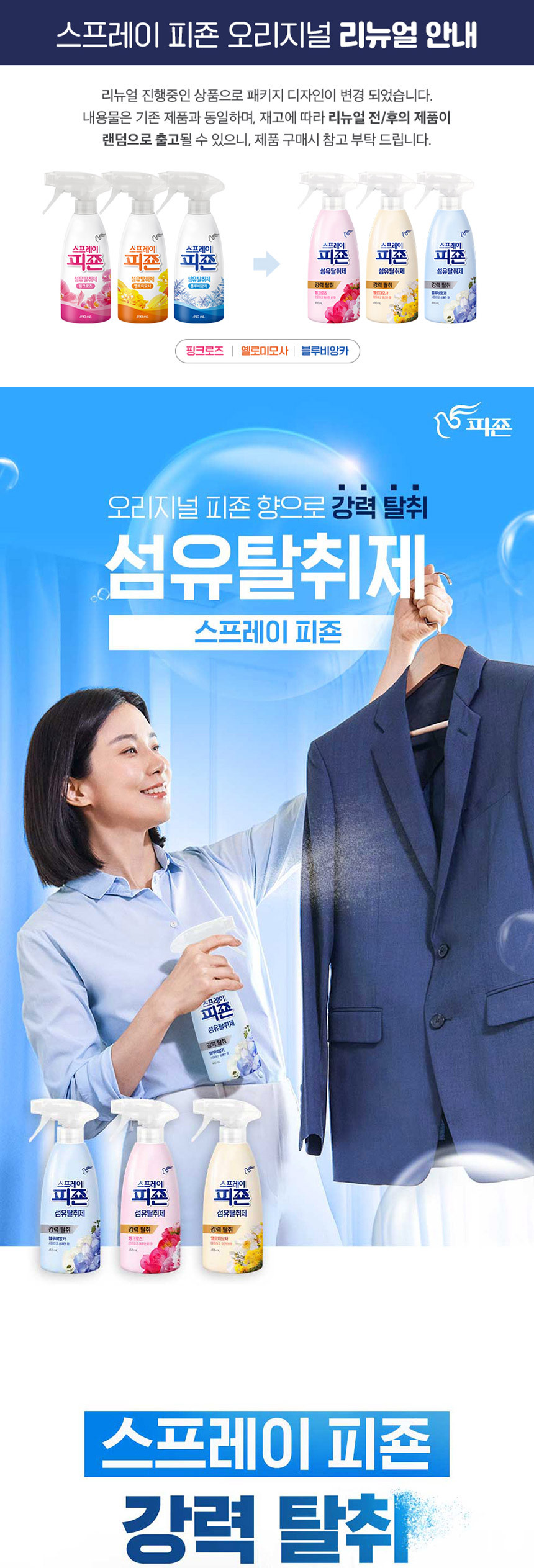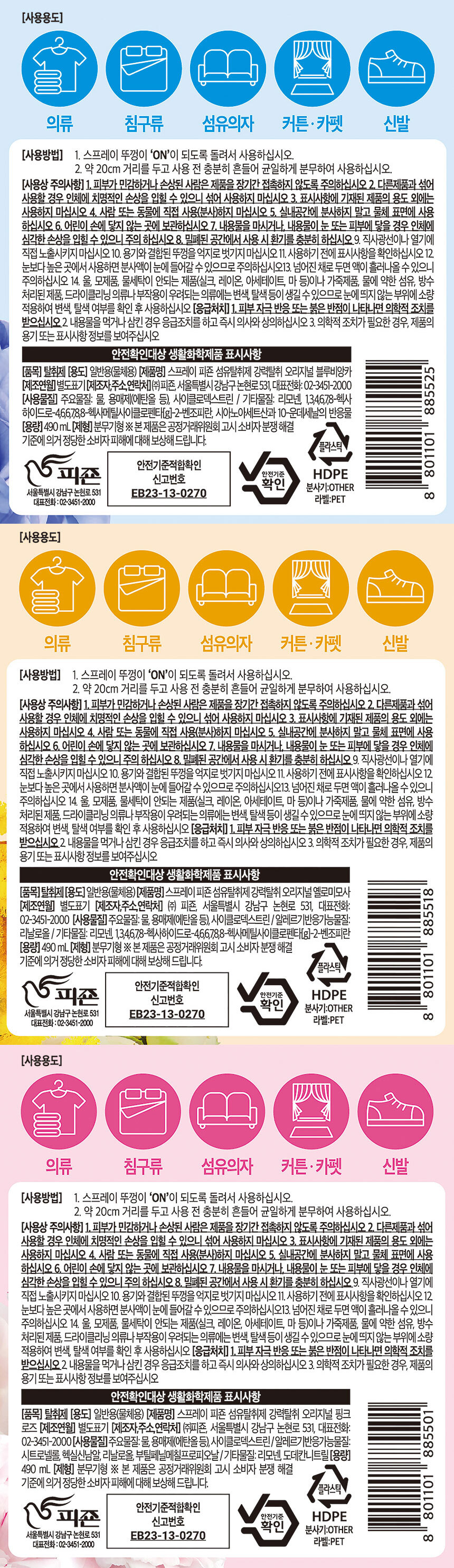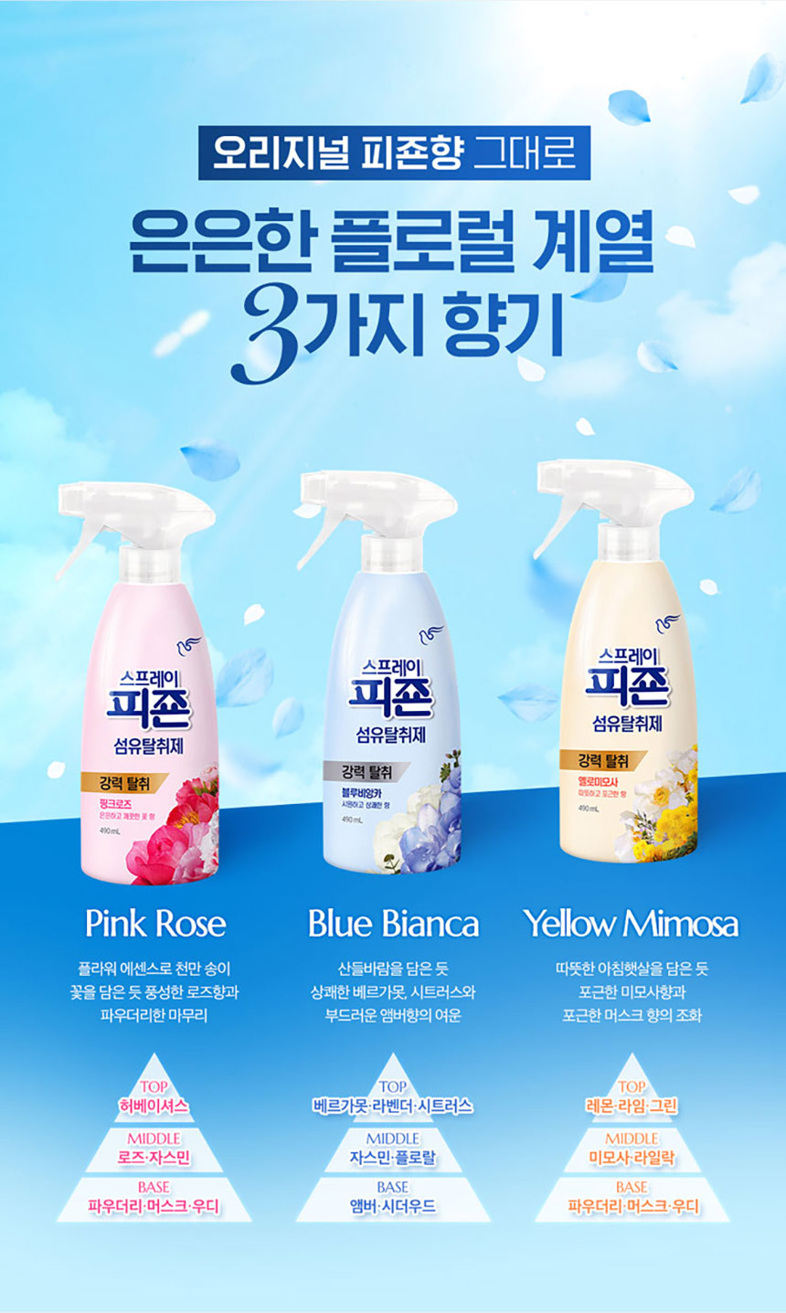 피죤 섬유탈취 스프레이490mlx3개(핑크/옐로/블루) +메쉬 파우치